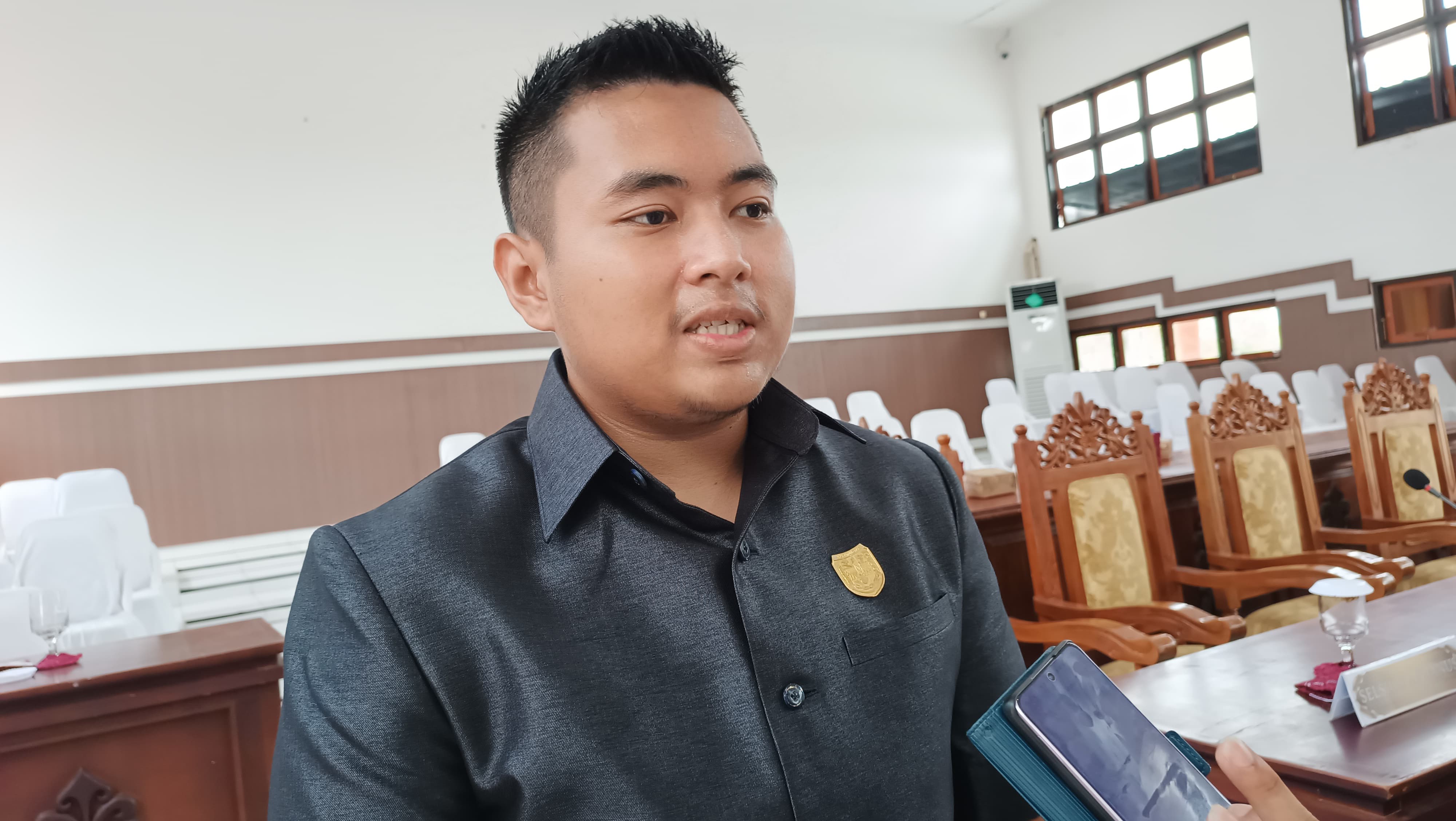 WAWANCARA : Anggota DPRD Kabupaten Gumas Indra H Kiaji ketika diwawancarai awak media, usai pelaksanaan rapat paripurna, pekan lalu.